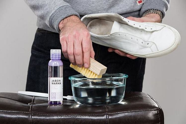 При использовании жидкого кислородного отбеливателя нанесите его тонким слоем и оставьте на три часа. Затем удалите грязь мягкой влажной тканью и промойте обувь теплой водой.