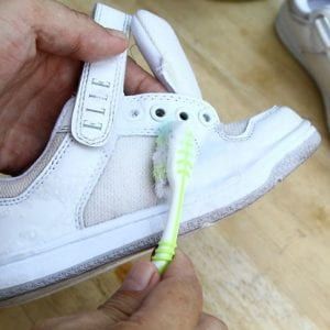 Еще один способ очистки включает пищевую соду, жидкое мыло и зубную пасту, можно добавить уксус. Смешайте компоненты до однородной массы и используйте зубную щетку для отбеливания. После механической очистки поместите обувь в таз с мыльной водой, постирайте и прополосните под проточной водой. Сушите кроссовки на улице.