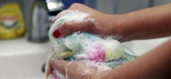 - Очень грязные вещи замачивайте несколько раз: в первый раз в обычной воде с содой, во второй — с моющими средствами.