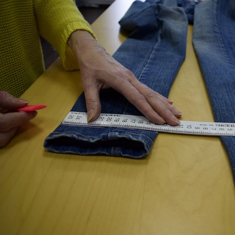 Подшивка джинсов начинается с подгибки. Если брюки помяты, их нужно отутюжить. Затем определите линию укорачивания и ширину подгибки.