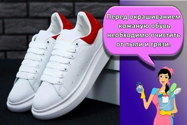 Перед окрашиванием кожаной обуви необходимо очистить ее от пыли и загрязнений. Для этого вымойте обувь, протрите сухой тряпкой и оставьте сохнуть. Если обувь из белой или светлой кожи, обезжирьте поверхность спиртом перед нанесением краски для равномерного цвета.
