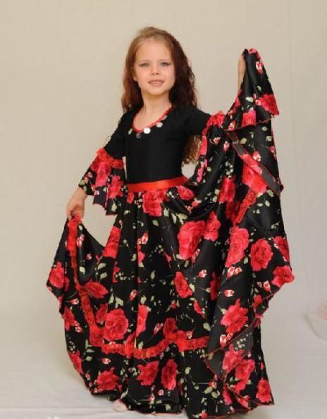 Танцевальная цыганская юбка для девочки может быть сшита из тех же оттенков, и даже такой «взрослый» цвет, как черный, будет смотреться органично.