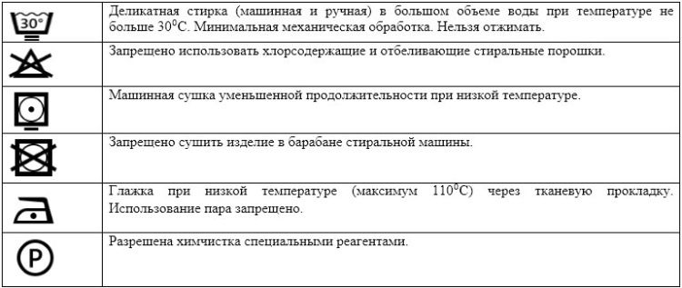 | Сушка | Воздушная сушка в расправленном виде, вдали от источников тепла и прямых солнечных лучей | Не сушить в стиральной машине, не гладить |