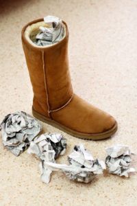 - отжимать сапожки руками не рекомендуется, заполните их мятой бумагой, чтобы она впитала воду;