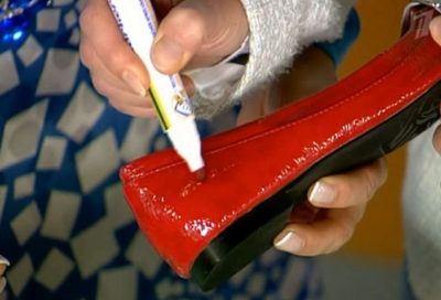 - Когда жидкость подсохнет, обработанный участок закрашивают краской в тон обуви, чтобы замаскировать место ремонта.