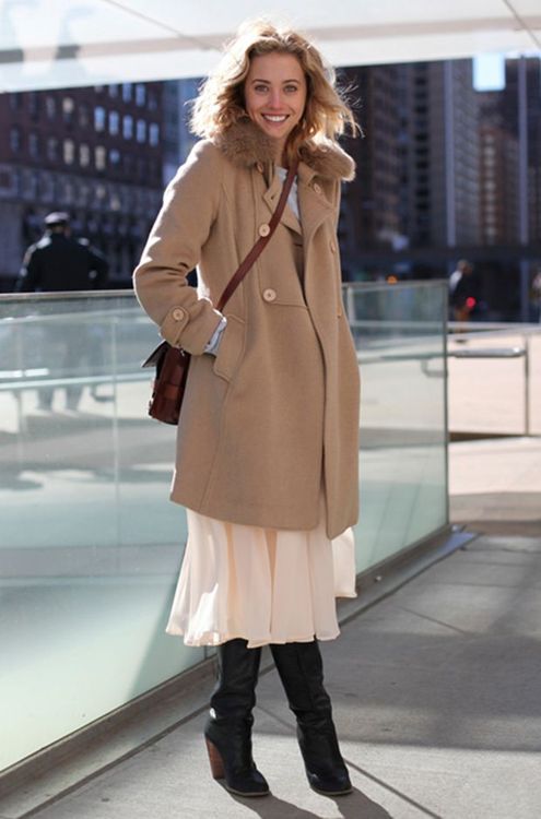 - Учитывайте принципы гармоничного стиля. Платье должно выглядывать из-под пальто не более чем на треть длины верхней одежды от линии талии. Такой подход выглядит эффектно.