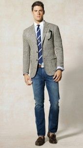 Твидовый пиджак — неизменный компонент мужского стиля вот уже много лет. Хорош для прохладного времени года. Лучше брать одно- или двух-пуговичный. Ну и конечно, не забываем про то, что застегивать нижнюю пуговицу не нужно. Кстати, как альтернативу, можно использовать вельветовый пиджак. Как видно по фото, твидовый пиджак и чинос горчичного цвета превосходно сочетаются.